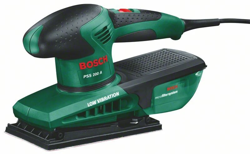 Schwingschleifer PSS 200 A. Höchste Oberflächengüte auf großen Flächen. Die ideale Lösung für feinsten Schliff und schnellen Schleiffortschritt mit leistungsstarkem 200-Watt-Motor und einer Schleiffläche von 92 x 182 mm. Sauber arbeiten dank Bosch Micro Filtersystem: Das eingebaute Staubsaugelement saugt den Staub direkt in die mitgelieferte Microfilter Box. Klettverschluss für schnellen und bequemen Schleifblattwechsel. Anschluss zur Staubabsaugung. Softgrip für angenehmes Arbeiten. Gute Handhabung auch für Linkshänder. Bosch Microfilter, Kunststoffkoffer, Schleifblatt (Red Wood) P120