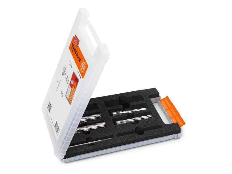 •Zubehörset Best of Kernbohrer 3/4 in Weldon Hohe Standzeit. Metrische Abmessungen, Schnitttiefe 50 mm. Set-Ausführung, bestehend aus 4 Kernbohrern Ø 2x 14 mm, 2x 18 mm (Schnitttiefe 50 mm) sowie 1 Zentrierstift (105 mm) im Kunststoff-Koffer.