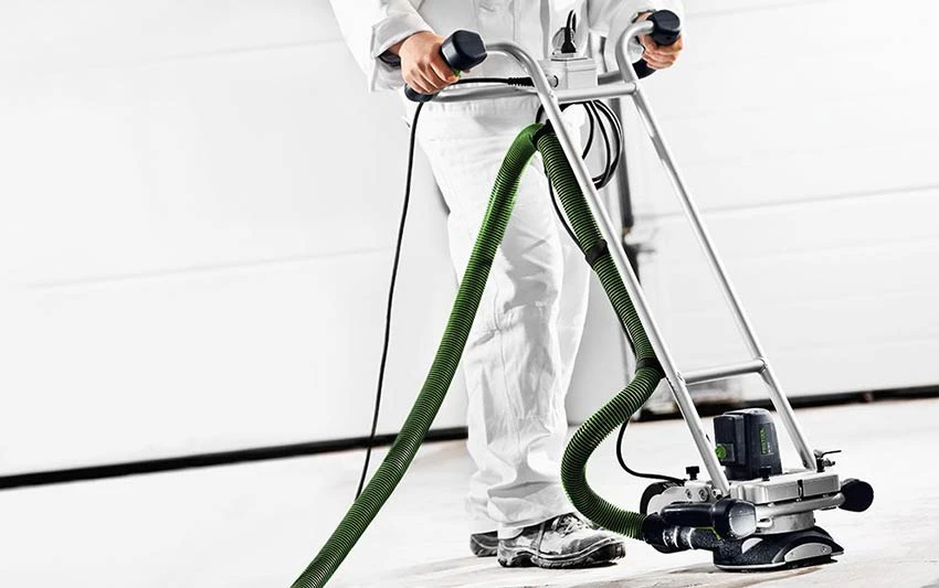 Die Renovierungsfräse RG 150 garantiert mit 150 mm Werkzeugdurchmesser und einem breiten Zubehörprogramm schnellen Fortschritt auf großen Flächen. In Verbindung mit der Bodenführung lassen sich Estrich, Beschichtungen und Kleberreste komfortabel abtragen. Für den leichten Einsatz an Wand statt Boden wird mit dem Balancer das Maschinengewicht ausgeglichen.