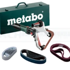 Zusatzhandgriff, 10 Schleifbänder Zirkon (40x760mm; P80), 2 Schleifbänder Pyramid (40x760mm; P280/A65), 2 Schleifbänder Pyramid (40x760mm; P400/A45), 2 Schleifbänder Pyramid (40x760mm; P600/A30), 2 Schleifbänder Pyramid (40x760mm; P1200/A16), 3 Vliesbänder (40x760mm mittel), Stahlblech-Tragkasten