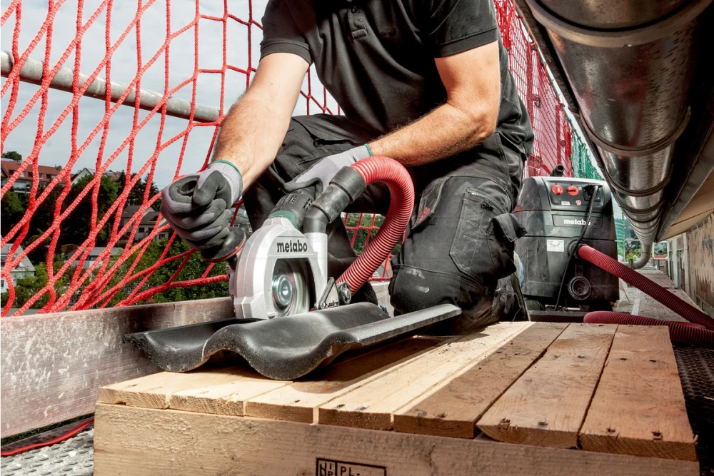 Ideal zum Schneiden von Dachziegeln und für vertikale Wandschlitze durch ziehenden Schnitt; Umbau auf schiebenden Schnitt möglich