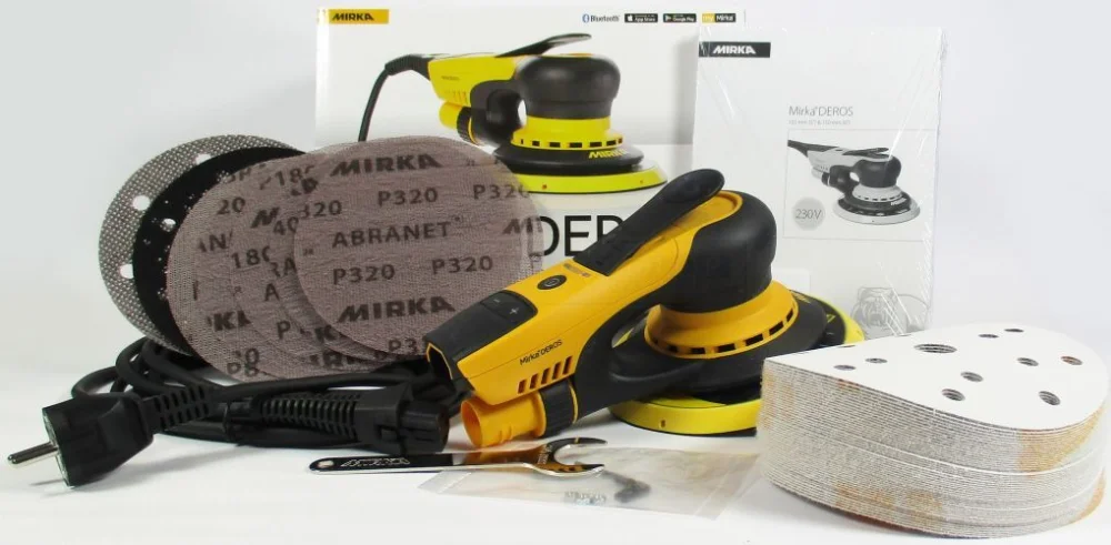 Der MIRKA® DEROS verfügt dank des hocheffizienten bürstenlosen Motors über starke Leistung und garantiert eine konstante Geschwindigkeit, selbst unter hohem Druck. Die innovative Konstruktion der Maschine sorgt für wenige Verschleißteile. Der DEROS ist wartungsarm, ultra zuverlässig und langlebig. Im Gegensatz zu herkömmlichen Maschinen hat der DEROS eine „geschlossene Bauweise“, die das Eindringen von Staub in den Motor und somit Abnutzung und Schäden verhindert. Mirka hat mit großer Liebe zum Detail eine Maschine entwickelt, die voller bahnbrechender neuer Eigenschaften steckt. Dazu zählen eine Soft-Start-Funktion, eine eingebaute elektronische Motorbremse und ein einfach zu bedienender Geschwindigkeitsregler. Das Stromkabel ist leicht abnehmbar und austauschbar. Der MIRKA® DEROS kann somit einfach verpackt und transportiert werden. Eine hochwertige ergonomische Bauweise hat beim MIRKA® DEROS, ebenso wie bei allen anderen Mirka-Maschinen, oberste Priorität. Der Exzenter kann so über lange Zeiträume ohne Ermüdungserscheinungen eingesetzt werden. Durch den extra Platz für Ring- und kleinen Finger kann der Anwender die Maschine kontrolliert und entspannt halten. Dank des symmetrischen Designs können Sie genau so komfortabel mit der linken wie mit der rechten Hand arbeiten. Der verlängerte Rumpf verfügt über ausreichend Platz für den beidhändigen Betrieb. Ohne externes Netzteil kann der DEROS innerhalb kürzester Zeit an verschiedenen Orten eingesetzt werden. Der MIRKA® DEROS ist dank seiner Eigenschaften und Vorteile die beste Lösung, wo immer eine Steckdose verfügbar ist.
