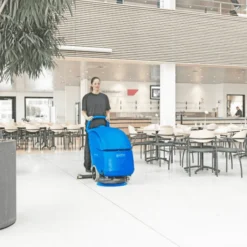 SCRUBTEC 343.2 offers excellent cleaning performance in a small compact size. Innovative squeegee lifting system operated by foot to increase comfort. Electronically controlled solution flows to save water. Solution and brush on/off thanks to the yellow switches directly on the handle. It´s ideal for light to medium floor cleaning tasks, and a reliable and productive machine with excellent performance, high safety and low service costs.